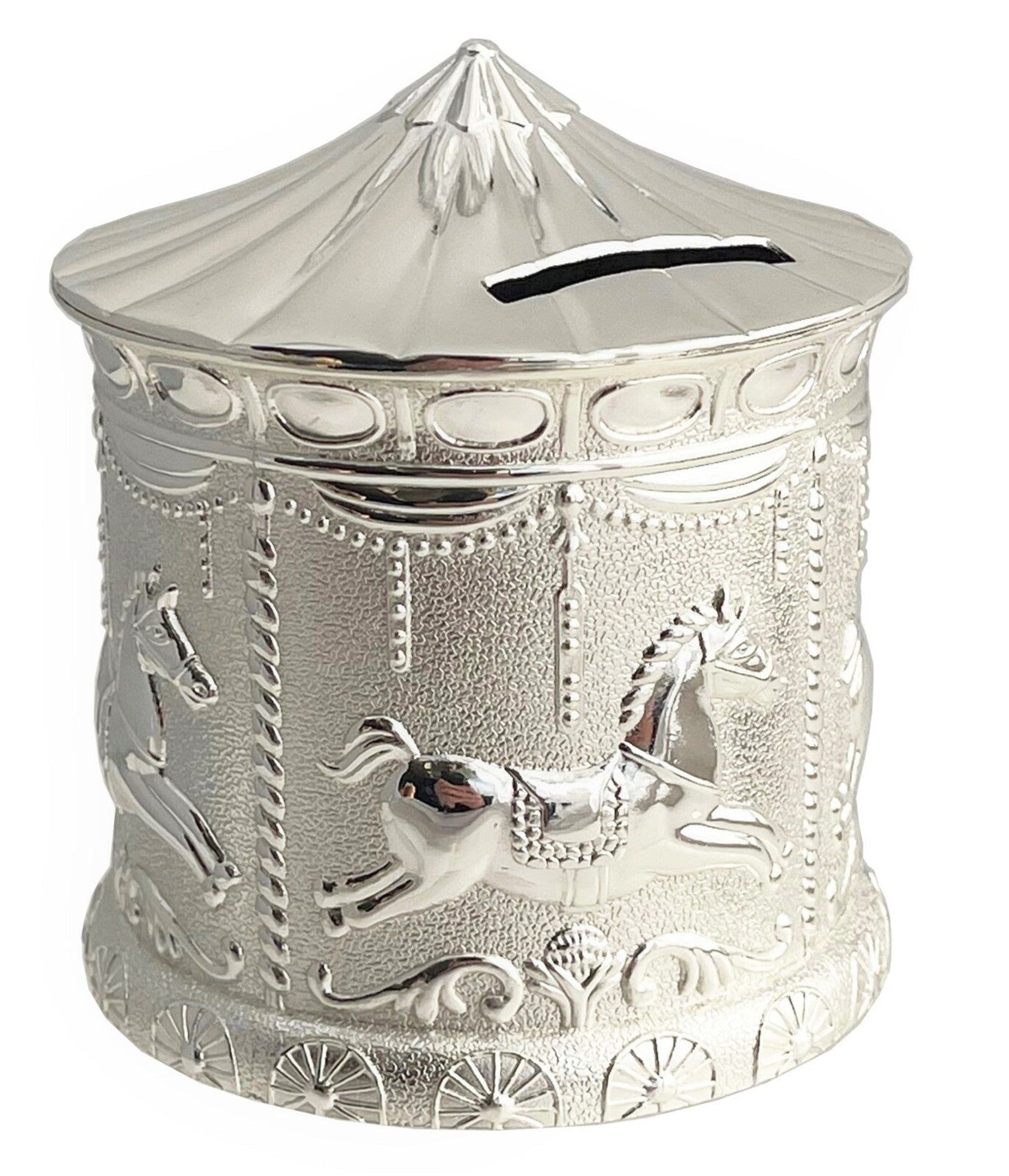 The Silver Merry Go Round Money Box is a charming and practical way to save your coins. Its rotating design adds a fun twist to saving money, making it enjoyable for all ages. Compact and stylish, it fits easily on any shelf or desk while helping you keep your savings secure.