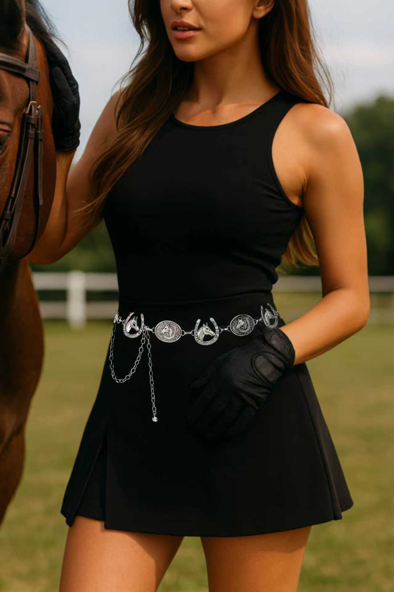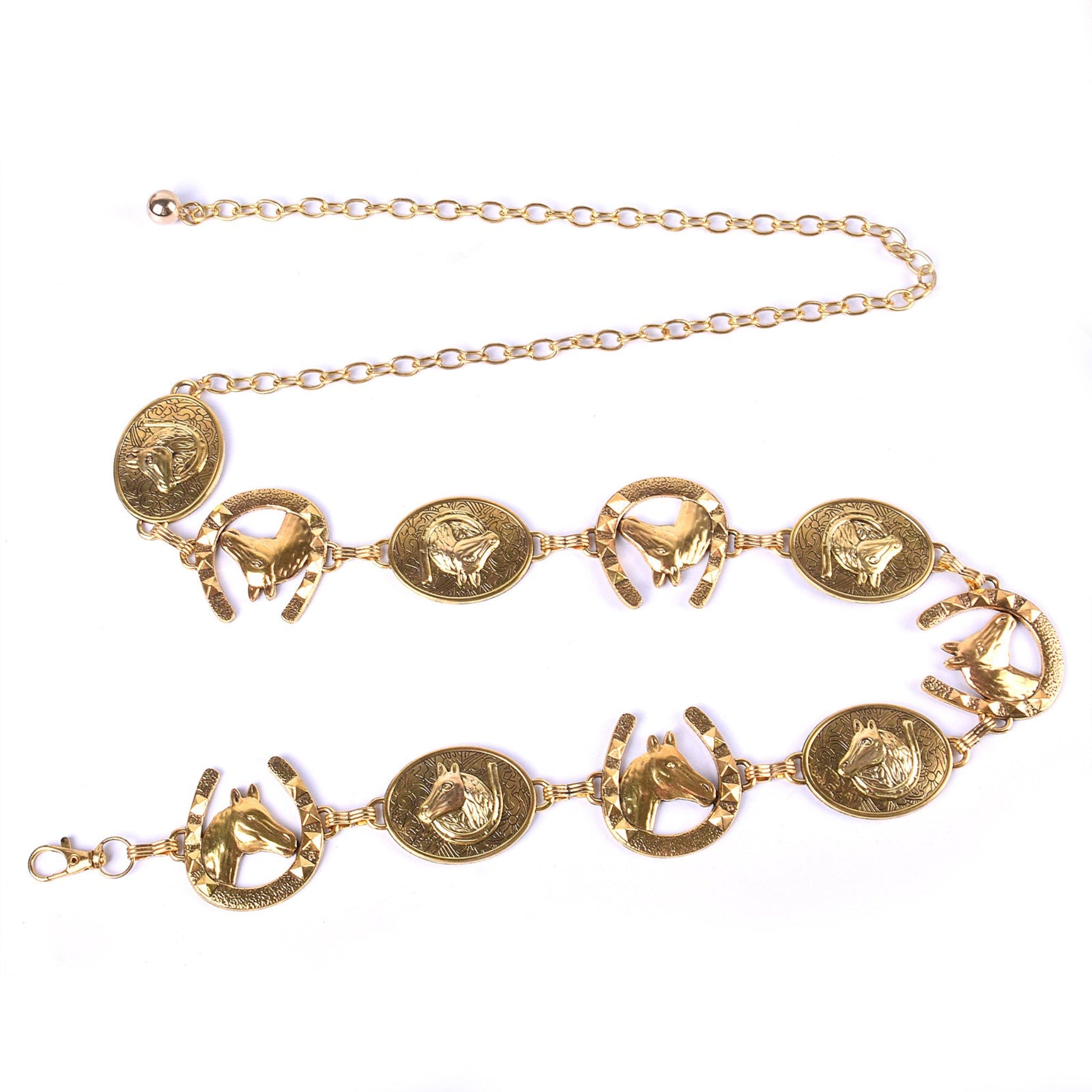 This striking chain belt features alternating horse head and horseshoe charms that celebrate your equestrian passion. The adjustable design ensures a perfect fit for any waist size, making it versatile enough for casual wear or to add a unique touch to your outfit. Crafted with quality chain links and detailed metallic charms, it's an ideal accessory for horse lovers who want to showcase their style with personality and flair