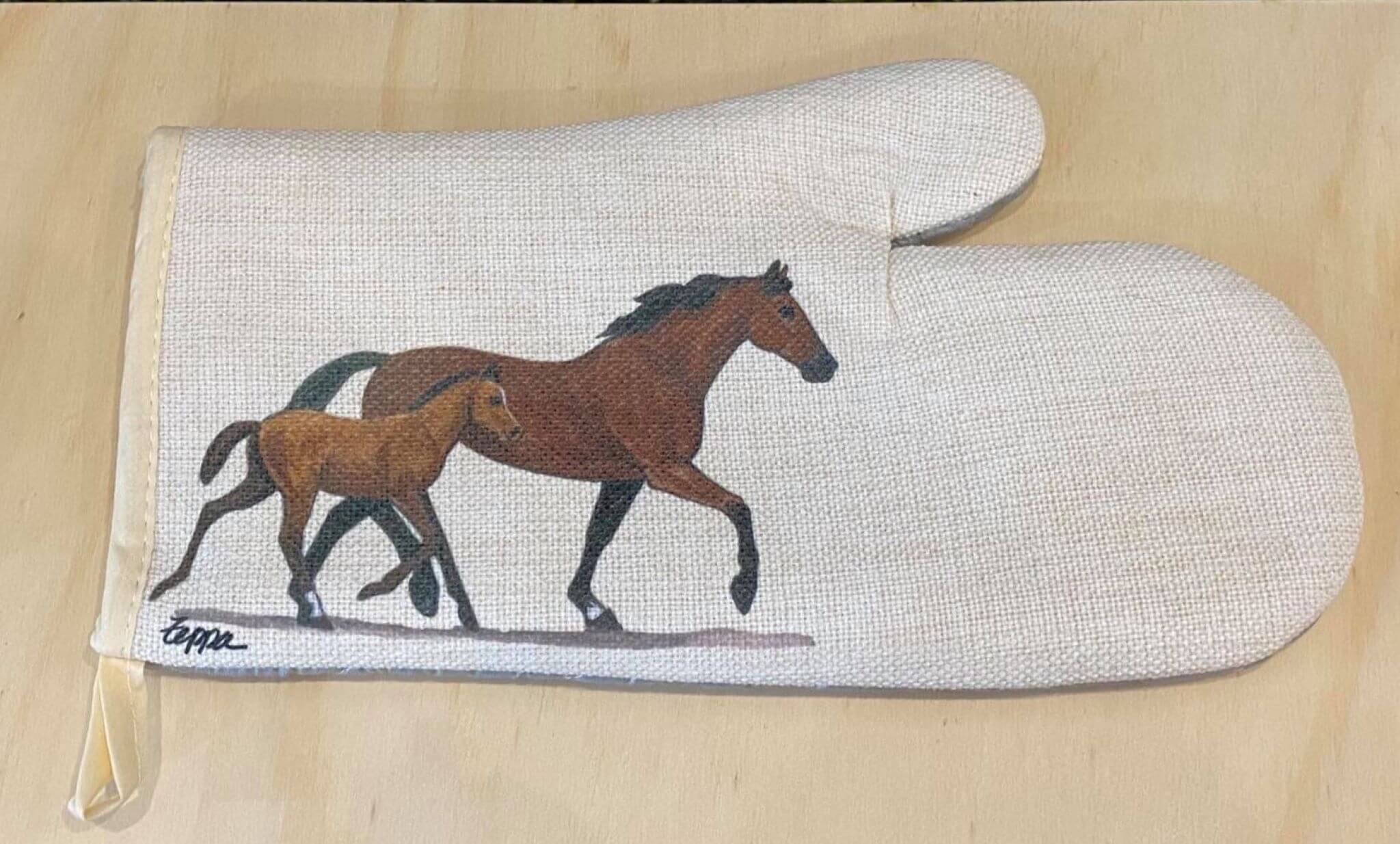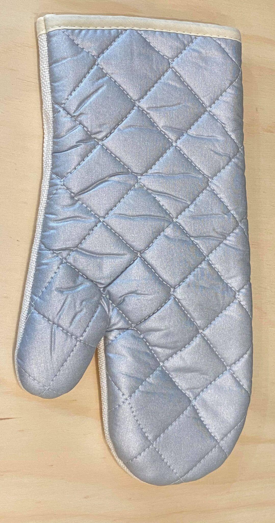 Quality Oven mitt , soft and luxurious inside with a fire resistant fabric one side and a lovely print on the back .