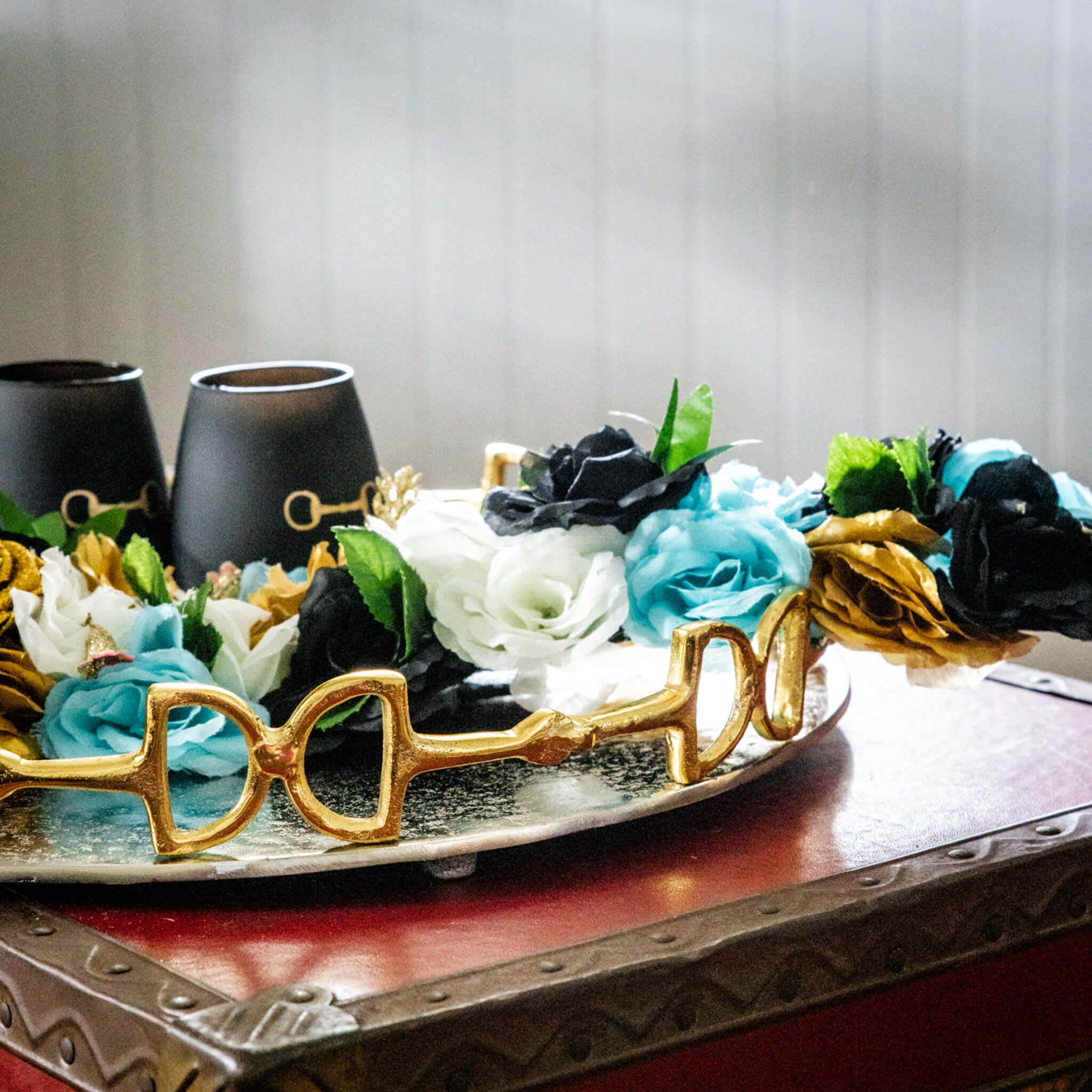 Transform your entertaining with this sophisticated Gold & Silver Snaffle Bit Round Tray. The luxurious two-tone finish brings timeless elegance to any sideboard, making it the perfect centrepiece for hosting guests. Use it to display appetisers, serve drinks, or simply showcase as a conversation-starting décor piece. Whether you're an equestrian enthusiast or simply appreciate refined design, this versatile tray adds a touch of class to your home while celebrating equestrian style.