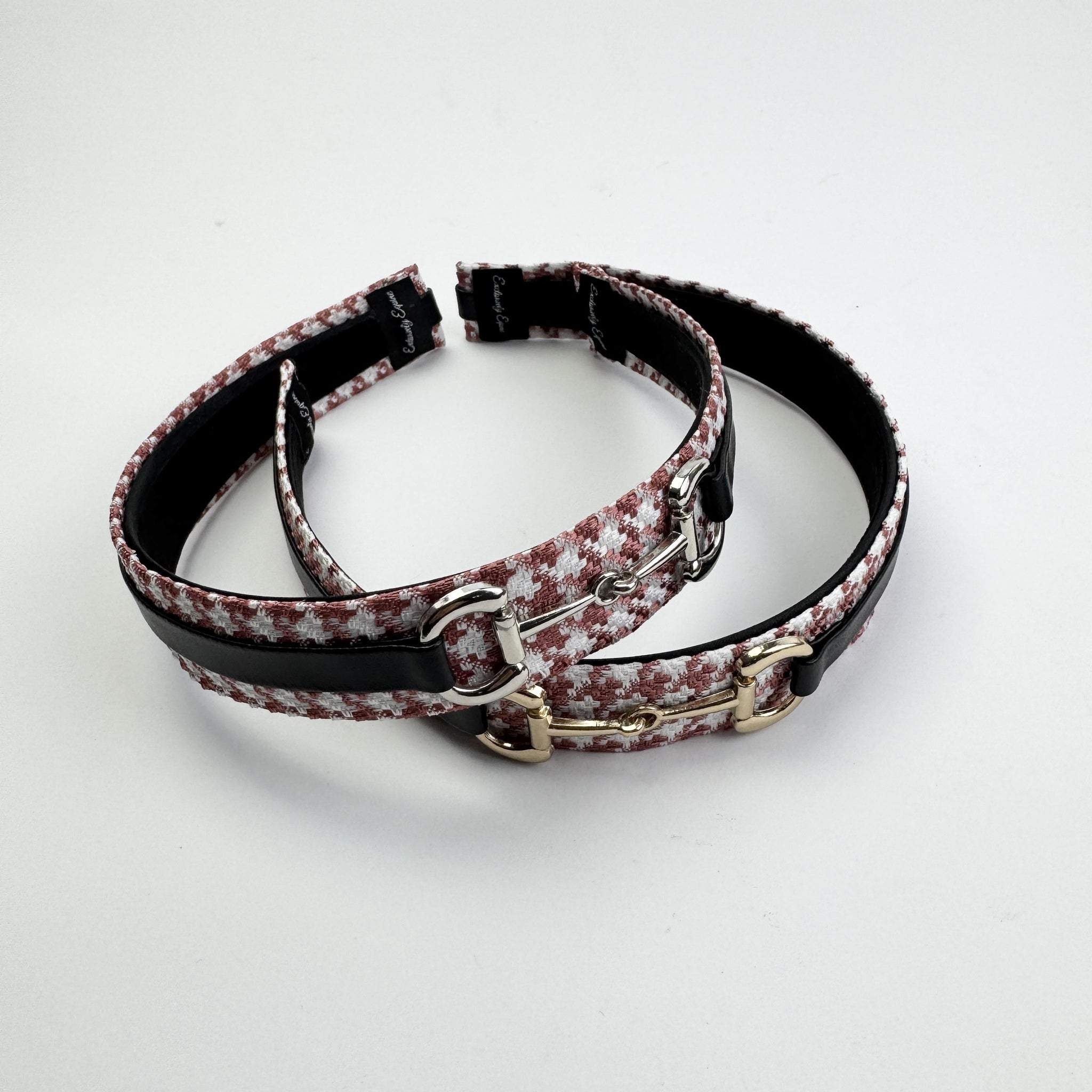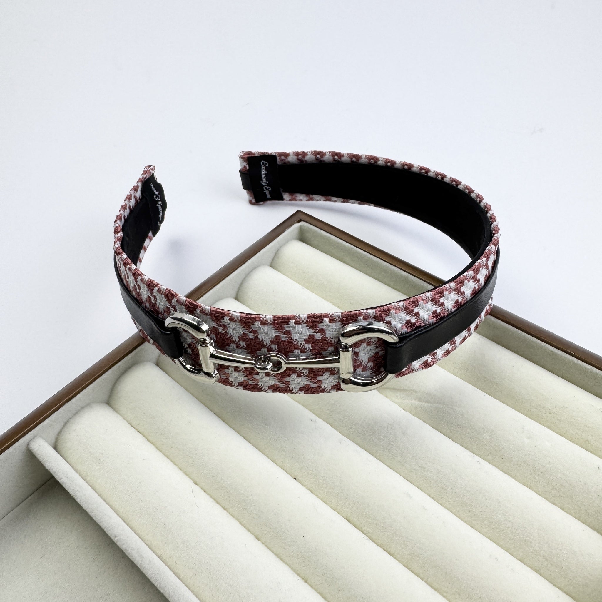 This stylish Pink houndstooth headband with the iconic snaffle bit trimmed with faux leather will finish off any outfit.