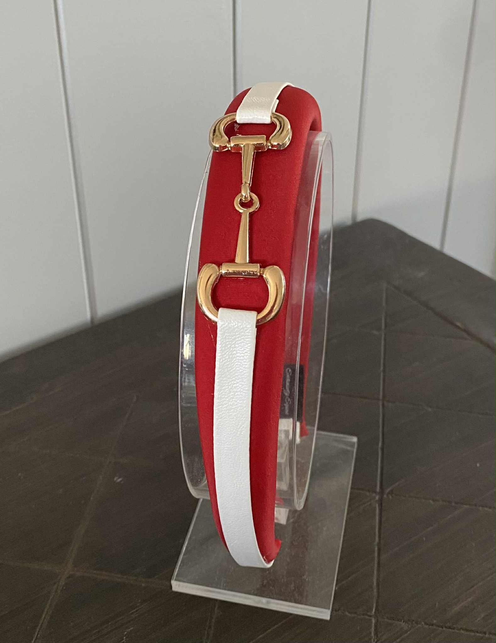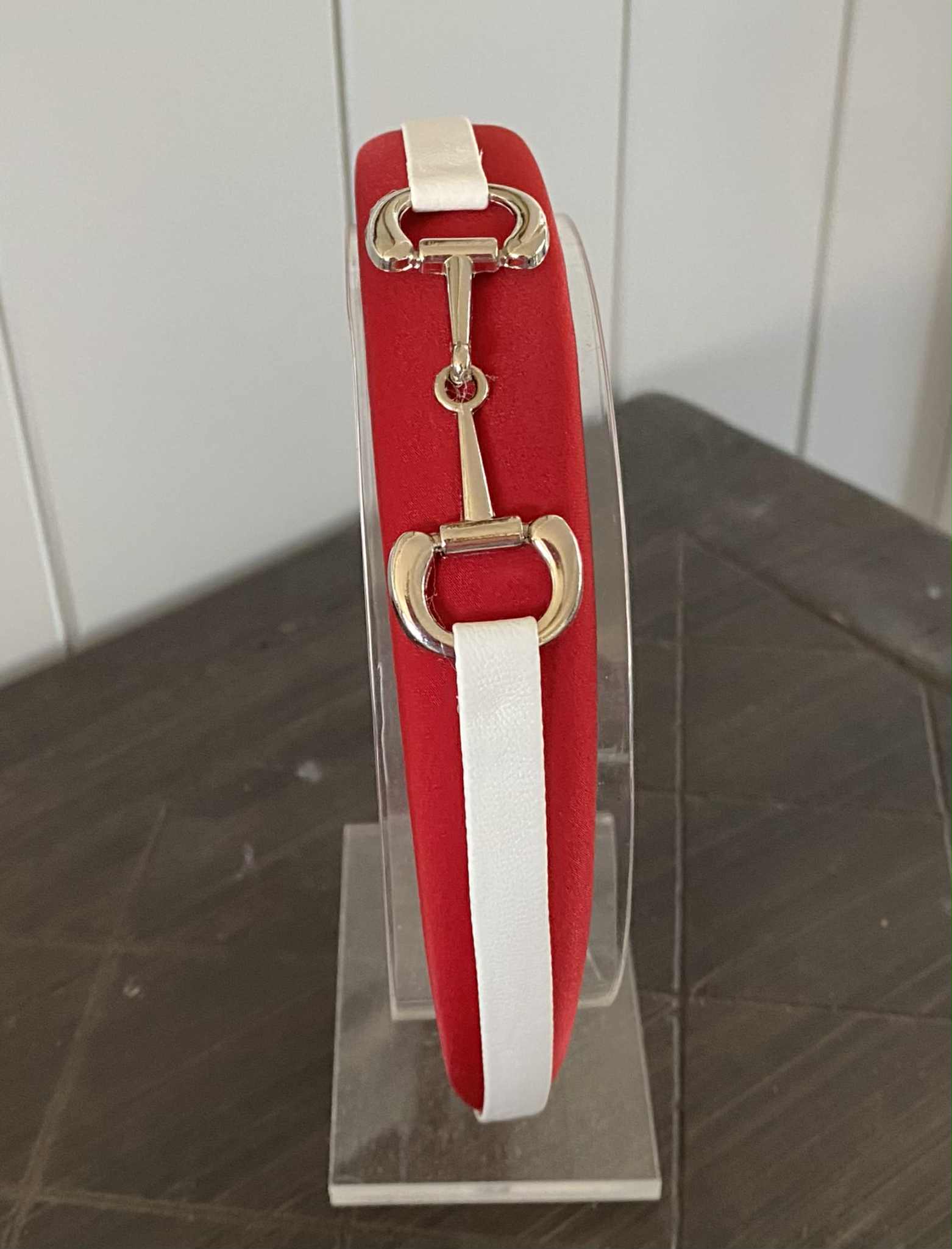 This padded headband features a striking red colour with white detailing and a decorative snaffle bit embellishment. Designed for comfort and style, it adds a charming touch to your riding gear while providing a gentle fit.