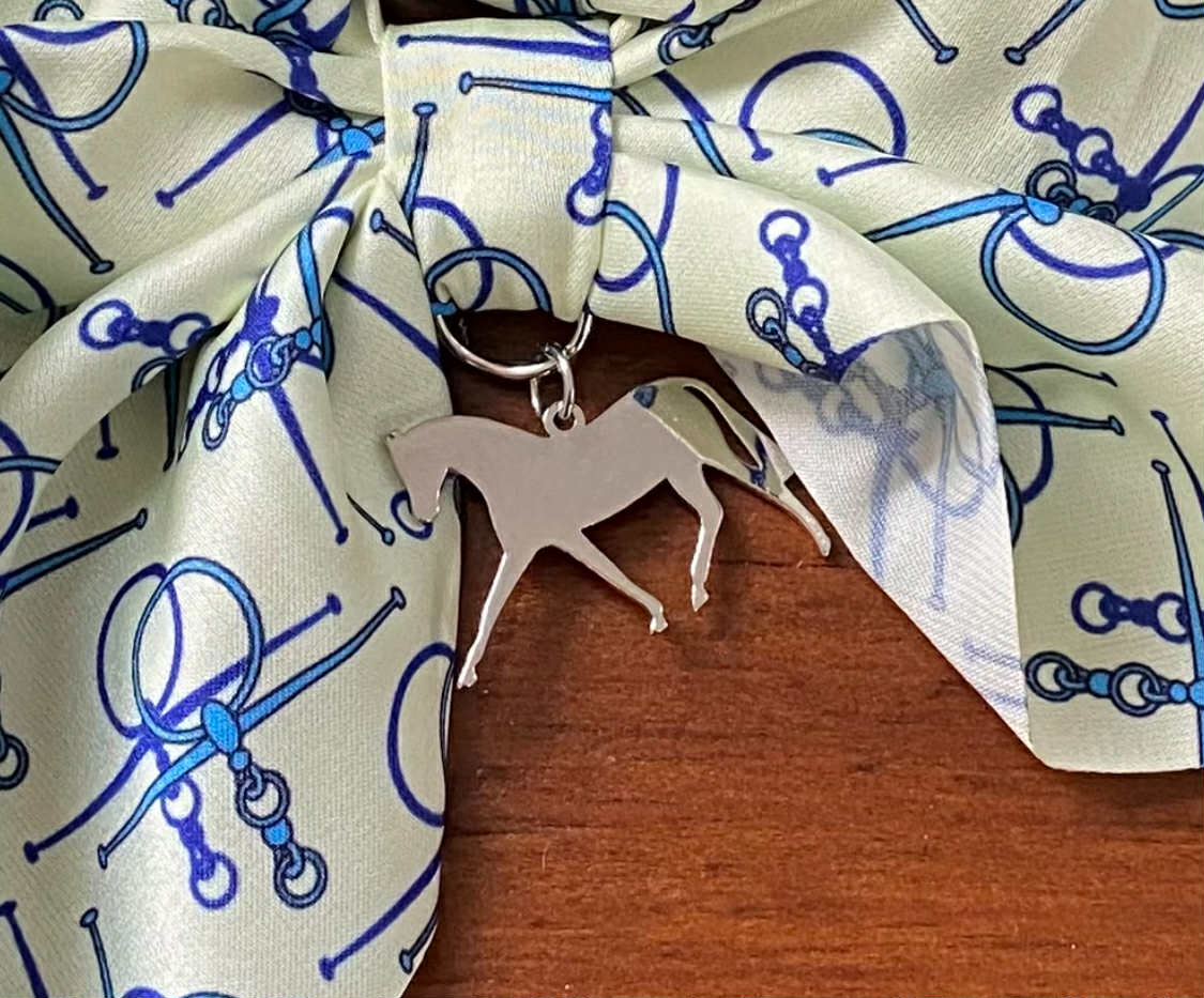 The Waterford Snaffle Scrunchie features a charming Waterford snaffle pattern adorned with a delicate horse embellishment. This simple, elegant accessory adds a subtle equestrian touch to your look while keeping your hair neatly in place. Perfect for everyday wear or training days.