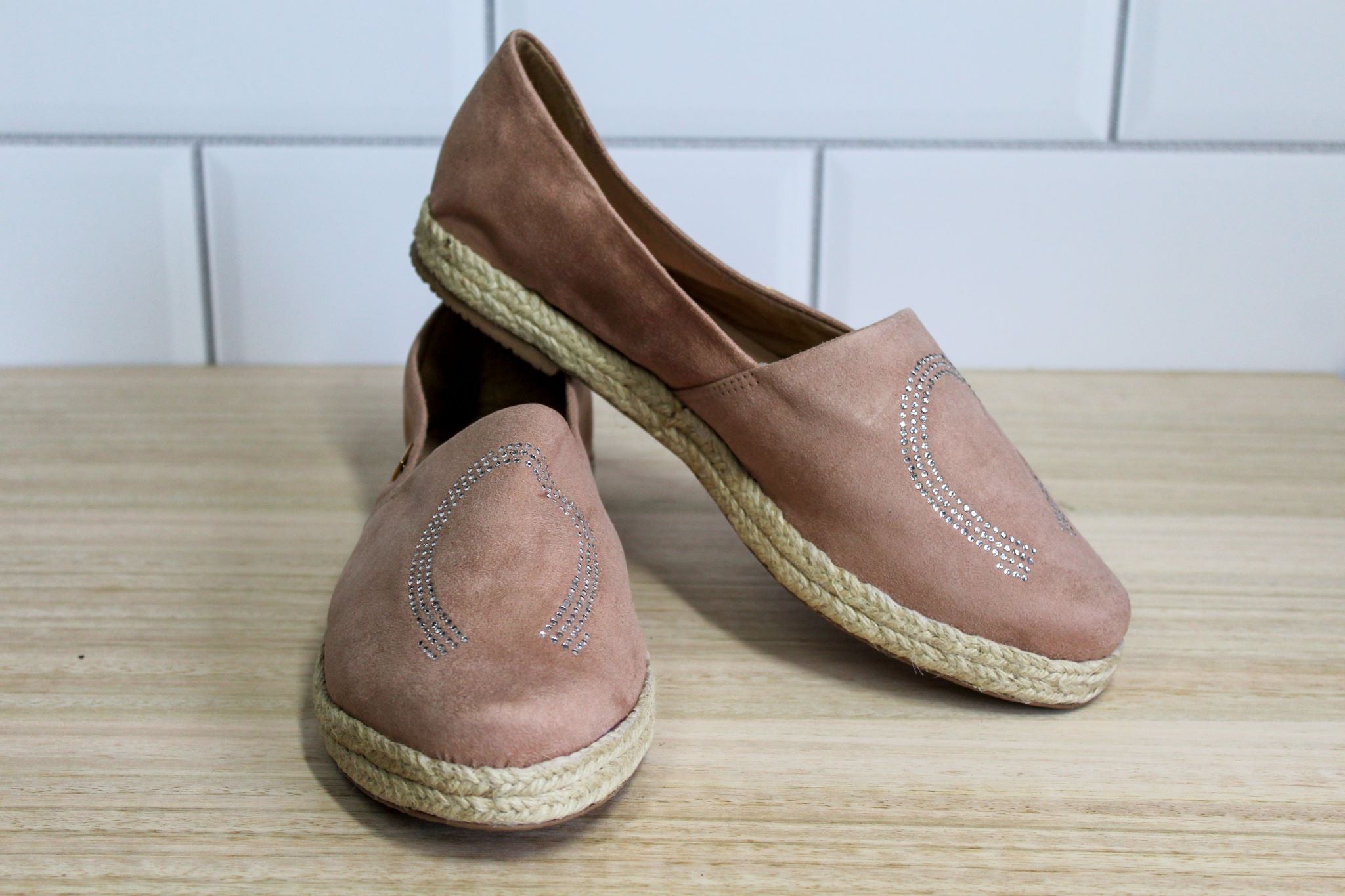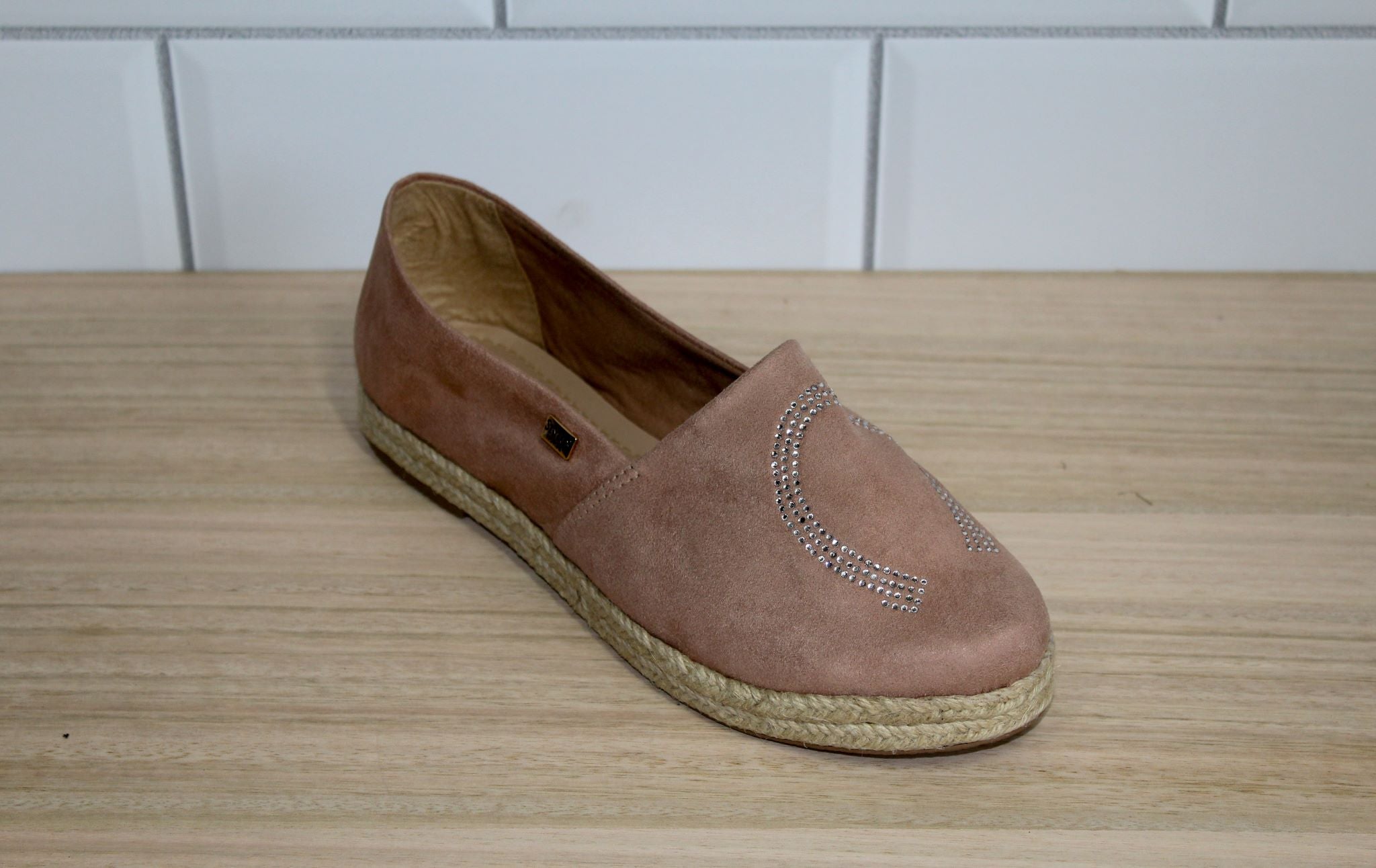 These ladies' loafers feature soft blush suede and a sparkling rhinestone horseshoe embellishment, combining comfort with a touch of elegance. Perfect for adding subtle charm to your everyday look.