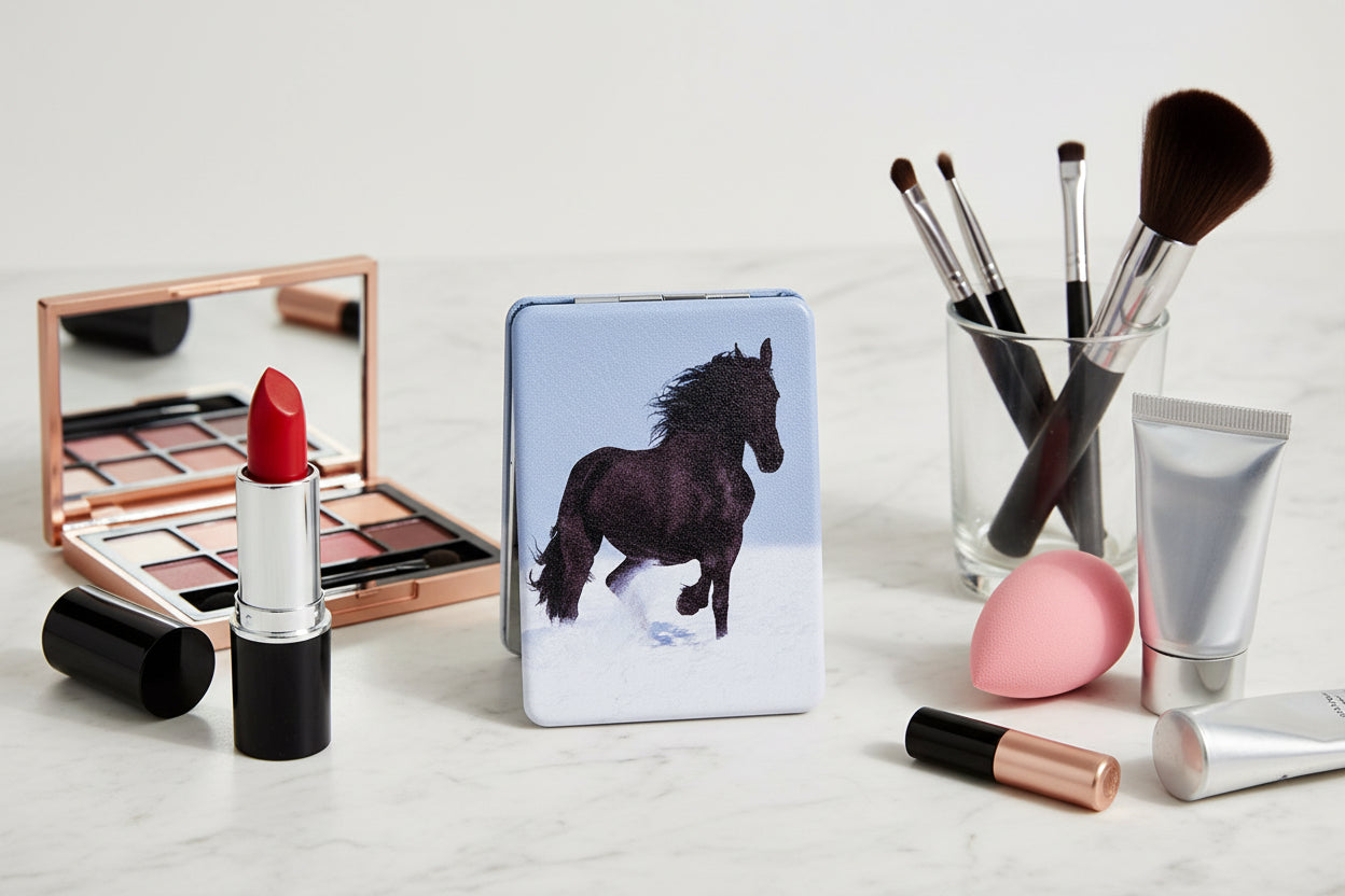 Carry a touch of equestrian elegance wherever you go with this Friesian Compact Mirror. Featuring a stunning Friesian horse design, this practical accessory combines beauty with function. Perfect for quick touch-ups on the go, the compact size fits easily in your bag or pocket. Ideal for horse lovers who appreciate quality craftsmanship and timeless style.