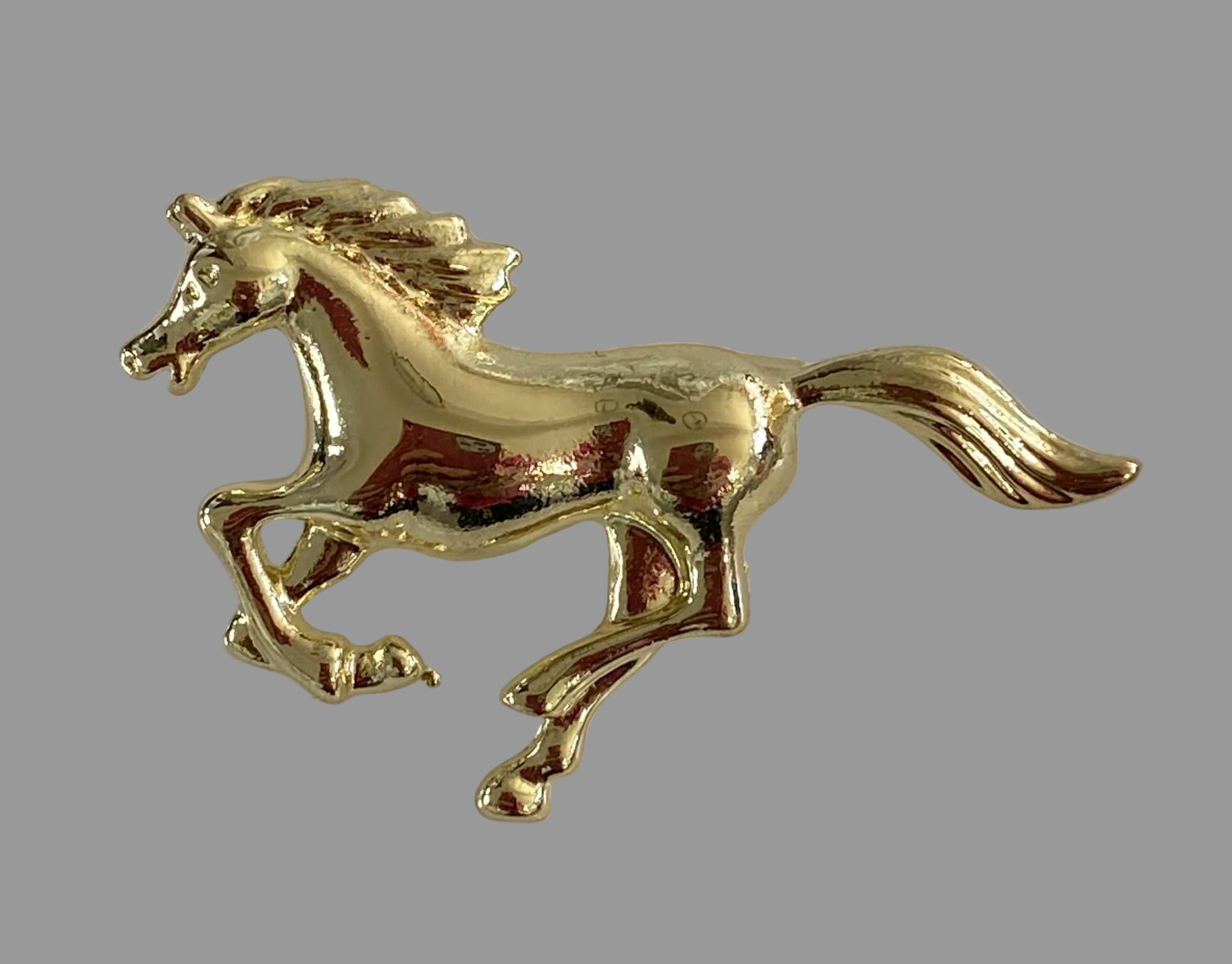 This Gold Galloping Horse Brooch captures the dynamic spirit of a horse in full stride. Its elegant design and polished gold finish make it a stylish accessory that adds a touch of movement and charm to any outfit. Perfect for horse lovers and those seeking a unique, timeless piece.