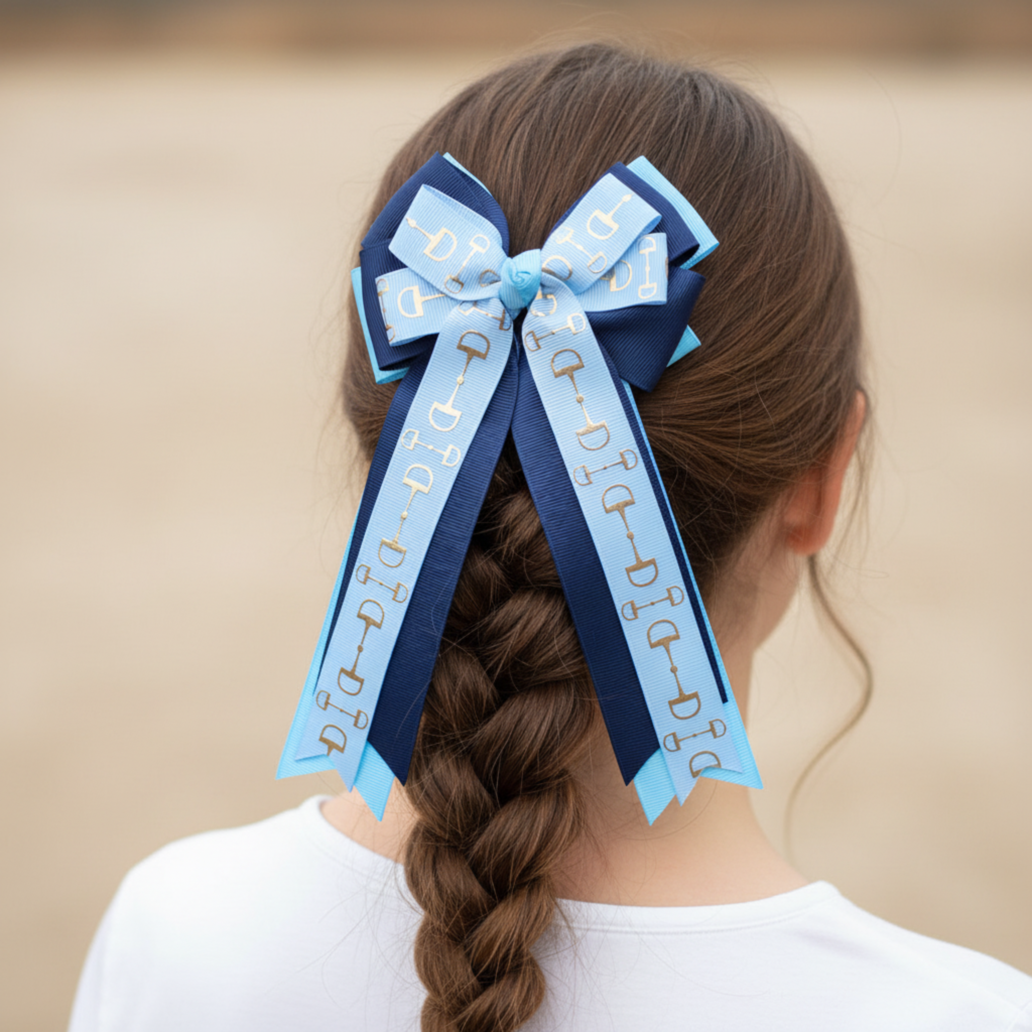 This charming bow combines sky blue and navy ribbon with striking gold foil accents, making it an ideal choice for equestrian enthusiasts. Whether you're heading to the stables or out and about, it adds a touch of elegance and flair to your everyday look. Perfect for those who love horses and want to express that passion with understated style.