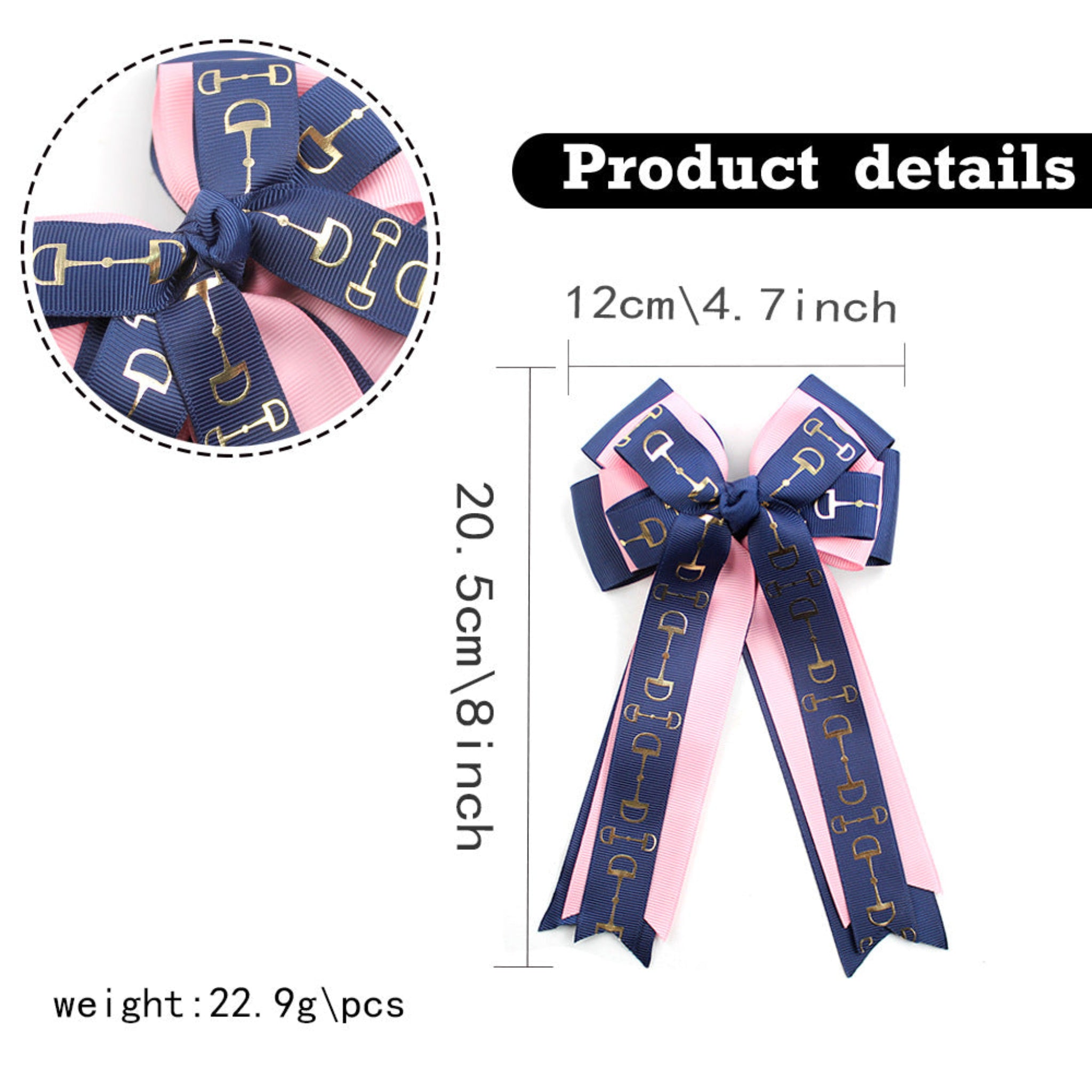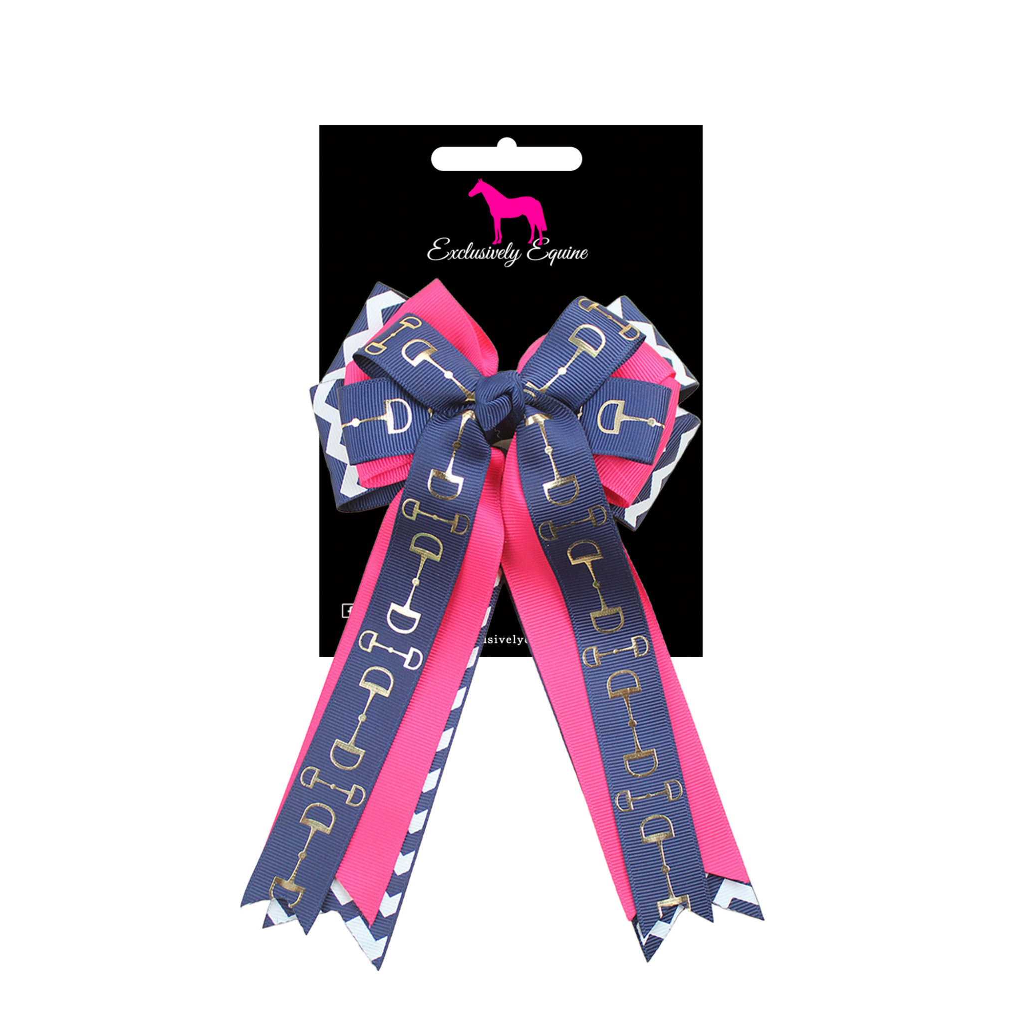 This charming bow combines navy and fuchsia ribbon with striking gold foil snaffle bits, making it an ideal choice for equestrian enthusiasts. Whether you're heading to the stables or out and about, it adds a touch of elegance and flair to your everyday look. Perfect for those who love horses and want to express that passion with understated style.