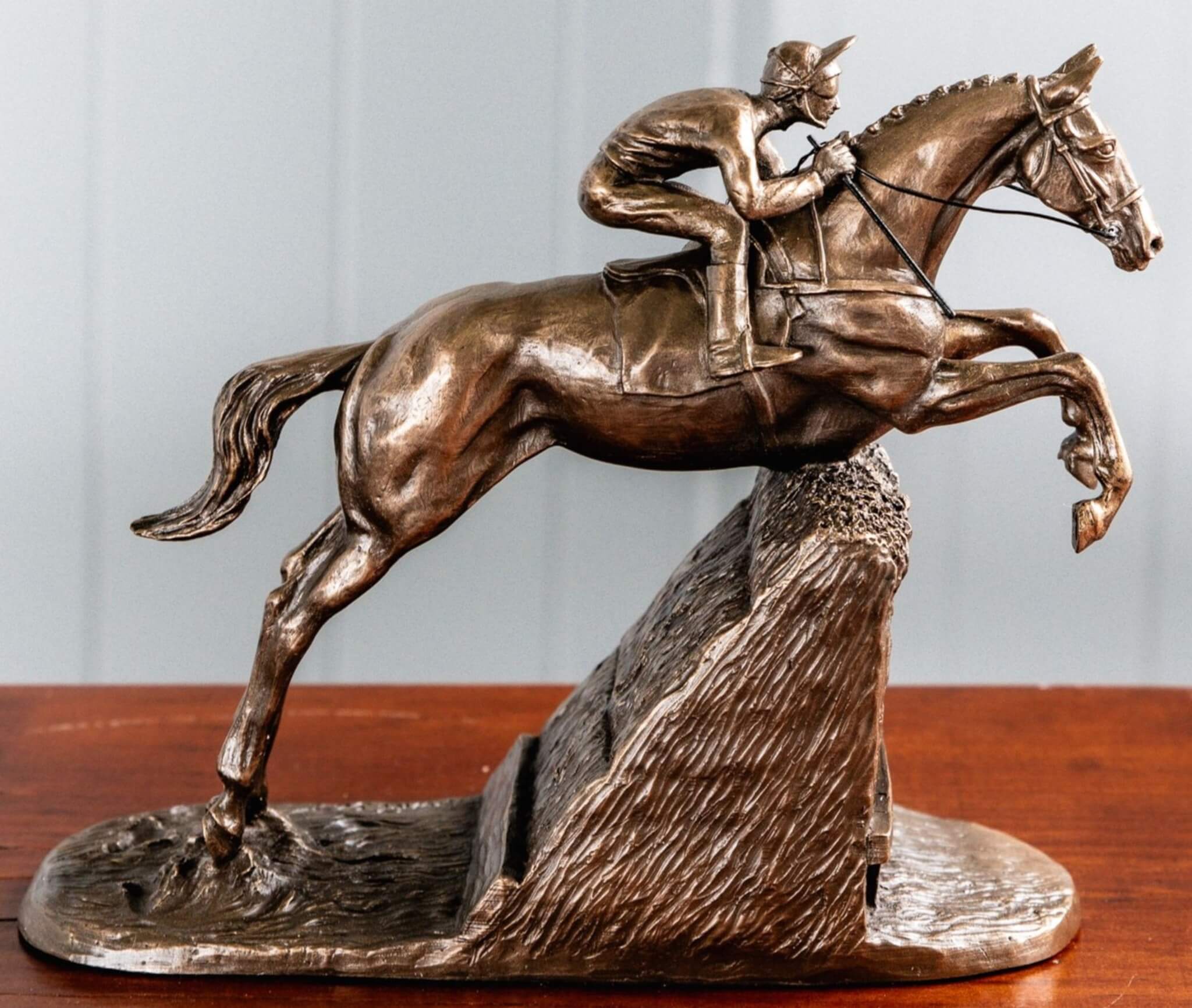 Capture the excitement of the race with this Steeple Chaser Sculpture. Crafted using cold cast technique, it beautifully depicts a horse and jockey mid-jump, highlighting the dynamic movement and energy of steeplechase racing. A perfect piece for horse racing enthusiasts or as a unique decorative item.