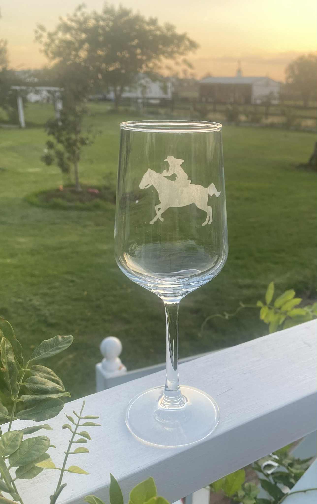 Celebrate the thrill of barrel racing with these striking wine glasses featuring an etched design of a girl galloping toward the finish line. Perfect for rodeo fans and horse lovers, these glasses capture the speed and determination of this exciting sport. Ideal for displaying your passion for western riding or sharing with fellow enthusiasts. A meaningful addition to any collection that honours the spirit of barrel racing.