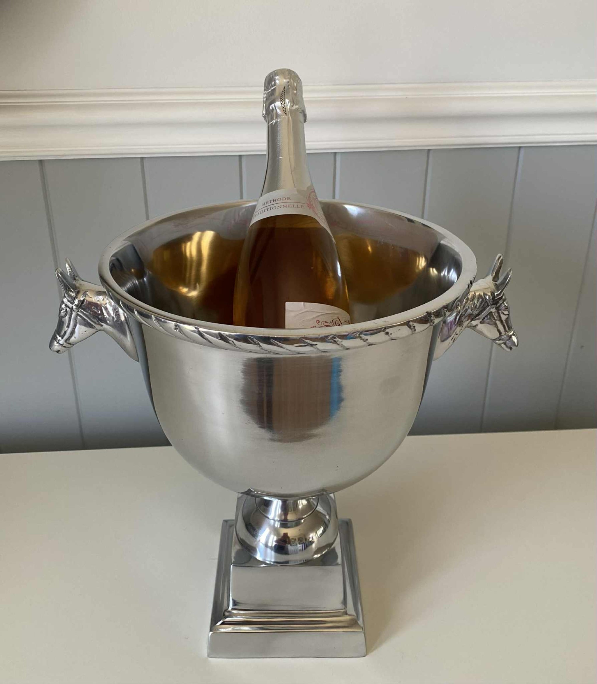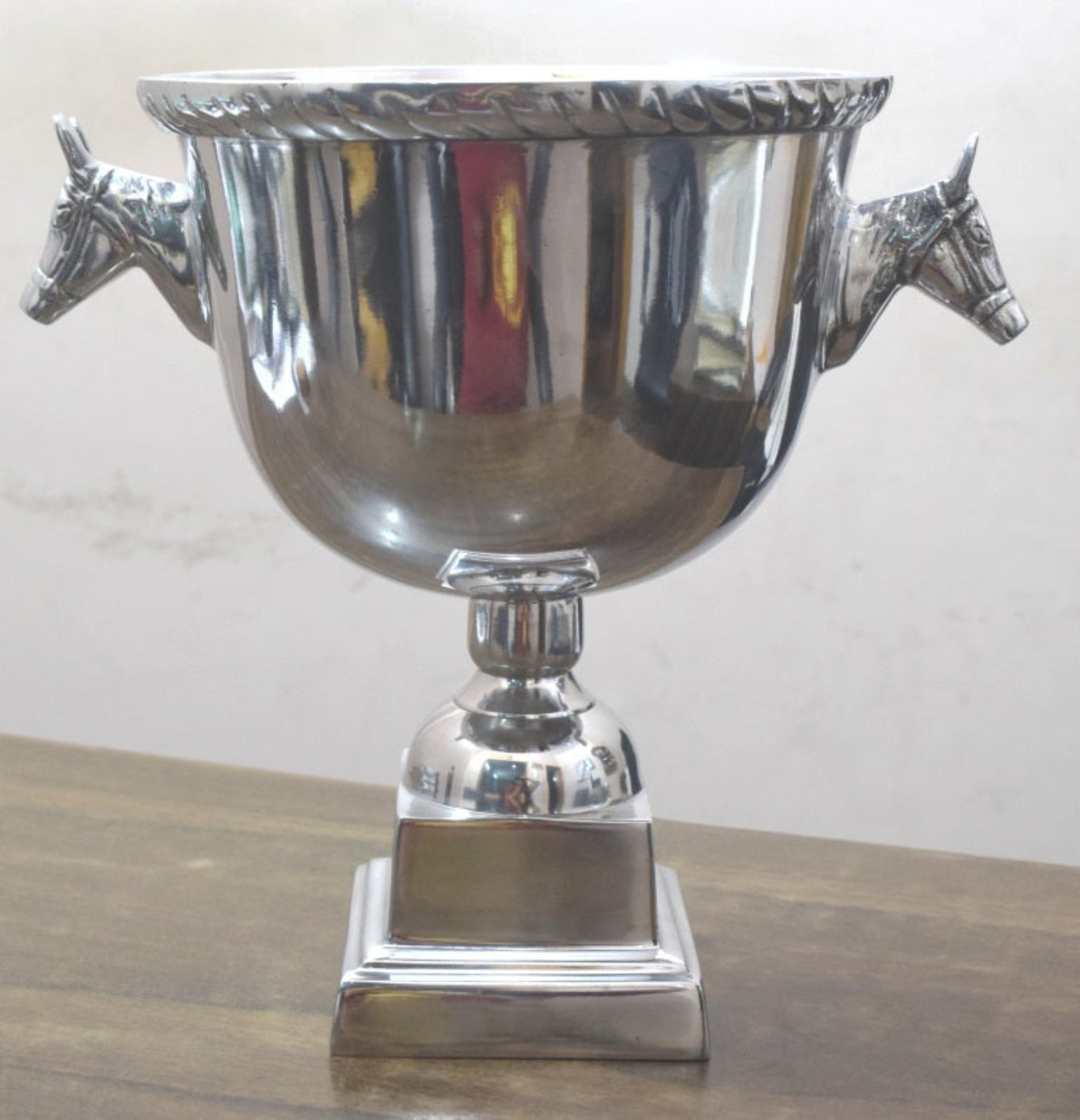Make a statement at your next celebration with this striking horse head ice bucket. Designed to chill champagne and beverages in style, this glamorous piece doubles as a conversation starter. Perfect for horse enthusiasts and those who appreciate bold, artistic home décor. Keep your drinks refreshingly cold while showcasing your love of horses with this unique and elegant accessory.
