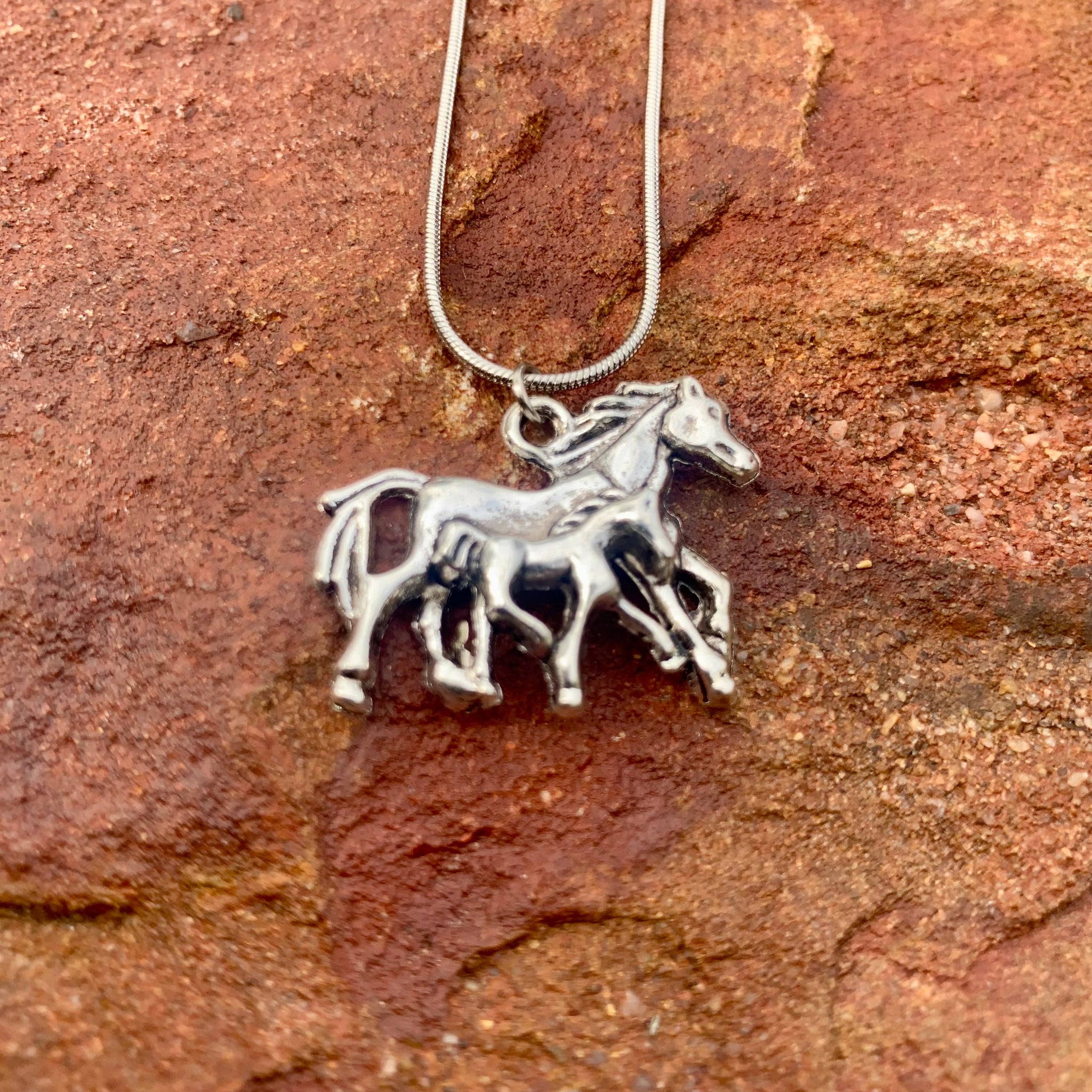 Celebrate the special bond between mother and foal with this elegant pendant necklace. Featuring a beautifully detailed horse and foal design, this piece is crafted on a delicate fine snake chain. The 16-inch (41cm) length with a 2-inch extender ensures a comfortable fit for most wearers. Perfect for equestrian enthusiasts or as a meaningful gift for horse lovers.