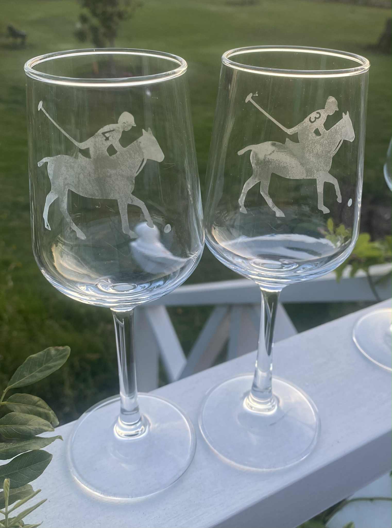 Celebrate your love of polo with this elegant pair of wine glasses featuring a skilled polo player wearing the number one on their sleeve. Each glass showcases detailed artwork that captures the spirit and prestige of the sport. Whether you're toasting after a match or enjoying a quiet evening, these glasses add a refined touch to any occasion. A perfect gift for polo aficionados and wine enthusiasts.