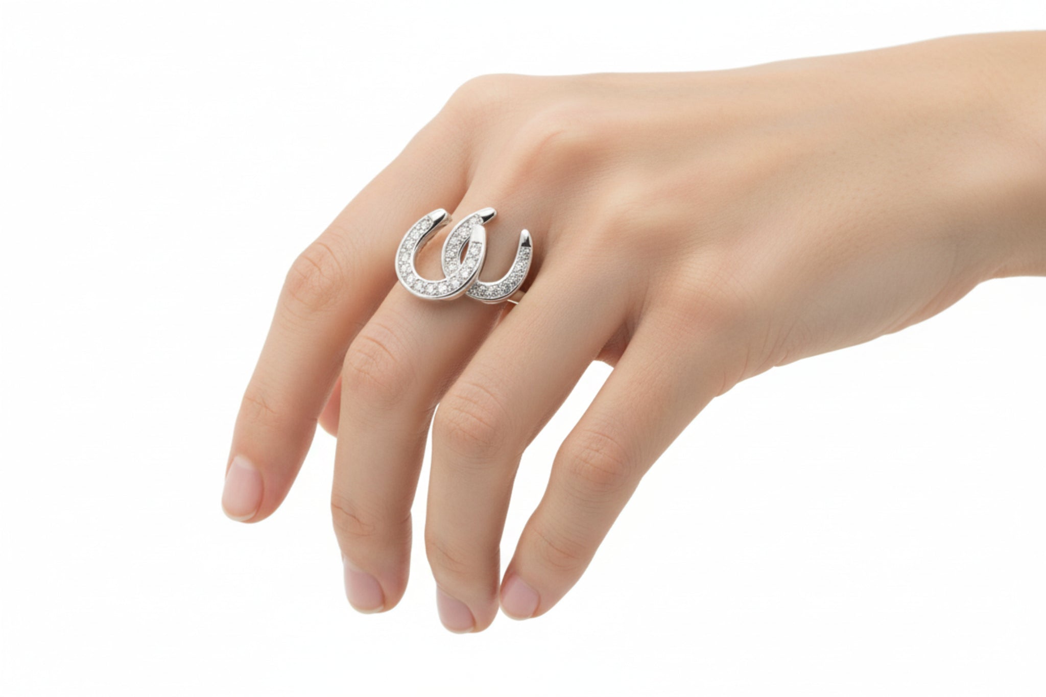 Bring a touch of equestrian elegance to your jewellery collection with this stunning sterling silver ring. Featuring two interlocking horseshoes adorned with sparkling cubic zirconia stones, it's the perfect accessory for horse lovers. Crafted from quality sterling silver, this piece combines timeless design with everyday wearability. Whether you're heading to the stables or out for the evening, this double horseshoe ring adds a distinctive charm to any outfit.