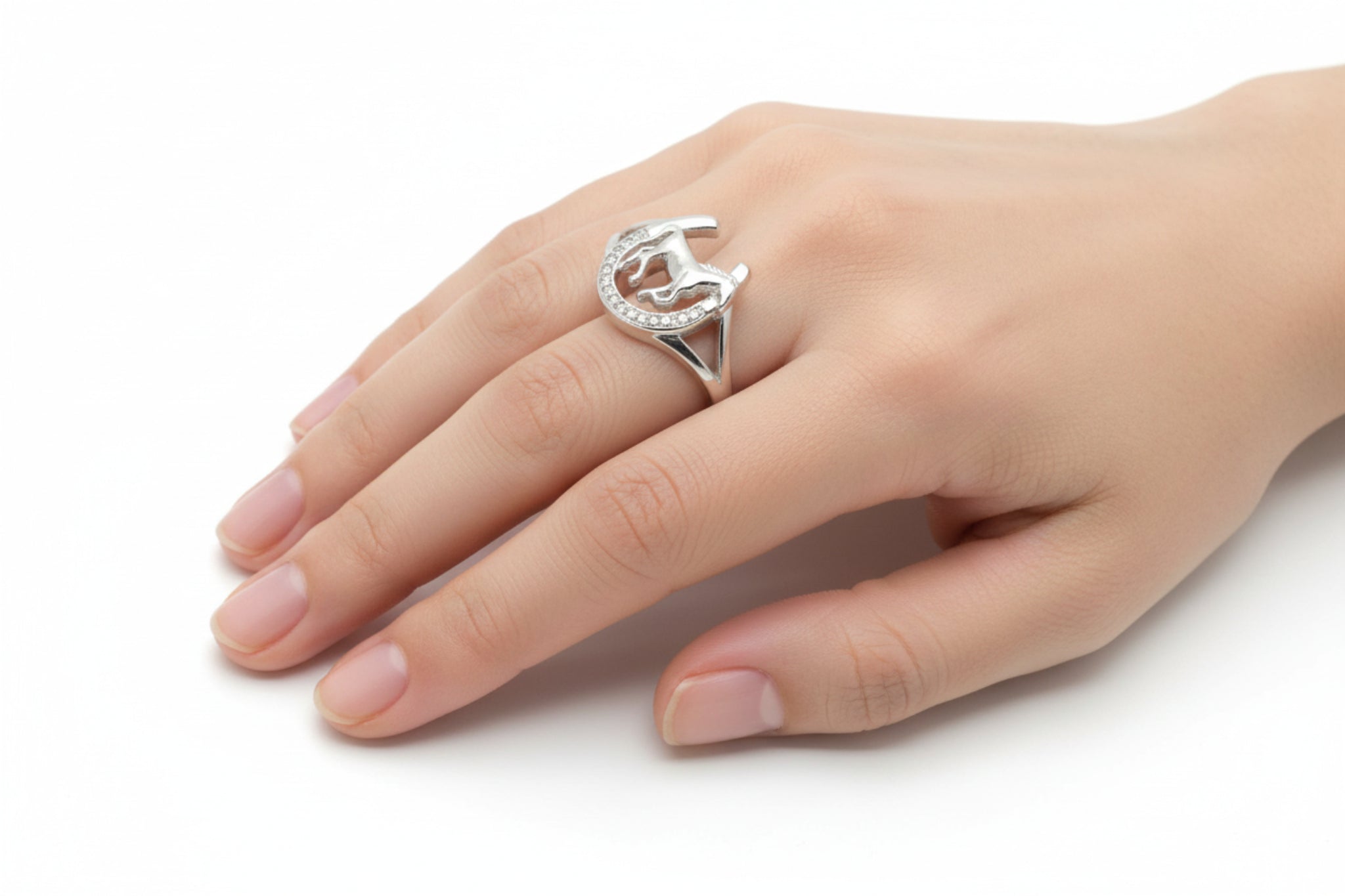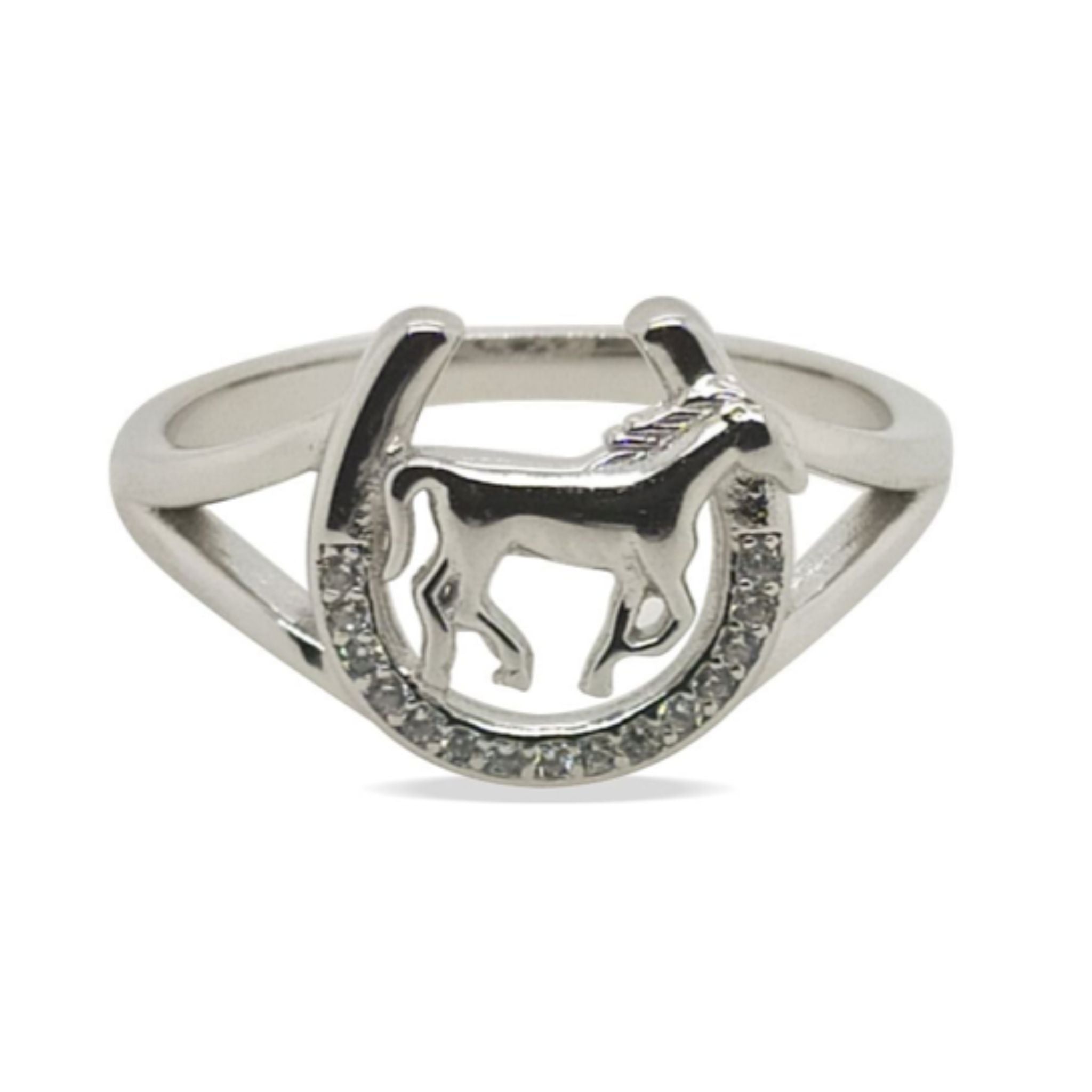 Elegant sterling silver ring featuring a detailed horse design paired with a sparkling cubic zirconia horseshoe. Perfect for equestrian enthusiasts who want to showcase their passion for horses in everyday style. The combination of polished silver and glittering stone creates a timeless piece that works for any occasion. A thoughtful gift for riders and horse lovers alike.