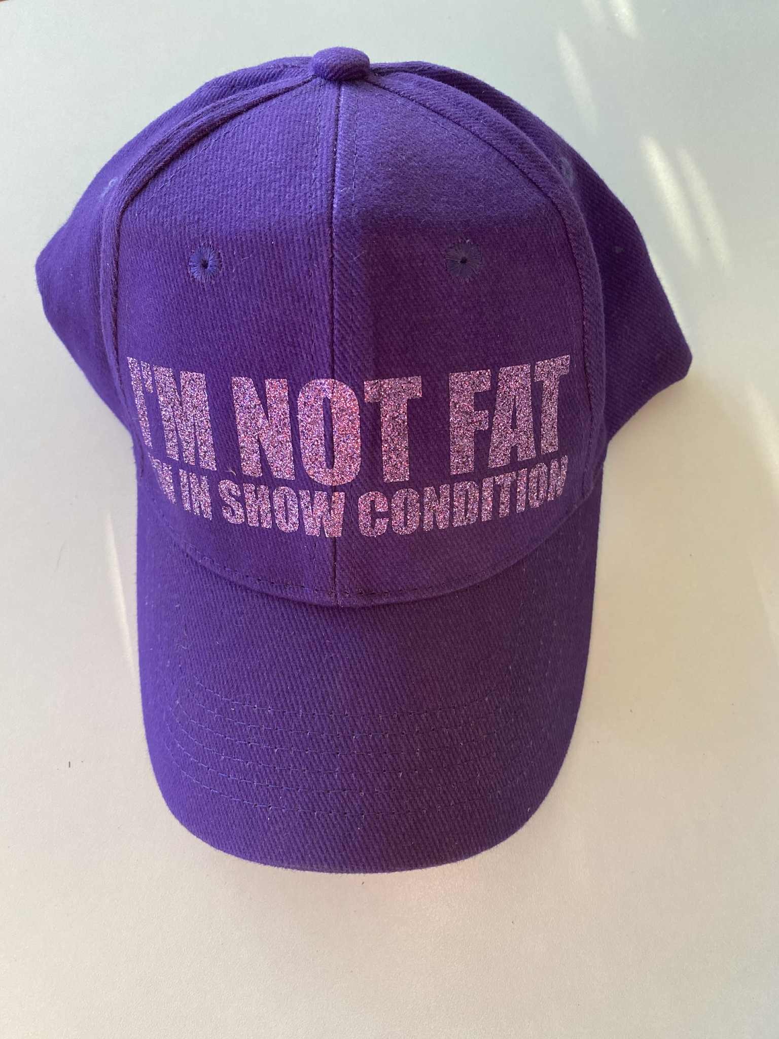 Show Condition Equestrian Glitter Cap A cheeky cap designed for riders who get it. Featuring the witty "I'm Not Fat I'm In Show Condition" glitter slogan, this cap brings humour to your stable wardrobe. Perfect for barn days, competitions, or casual outings, it's a fun way to celebrate equestrian life with a smile. The adjustable fit keeps you comfortable while you show off your sense of humour.
