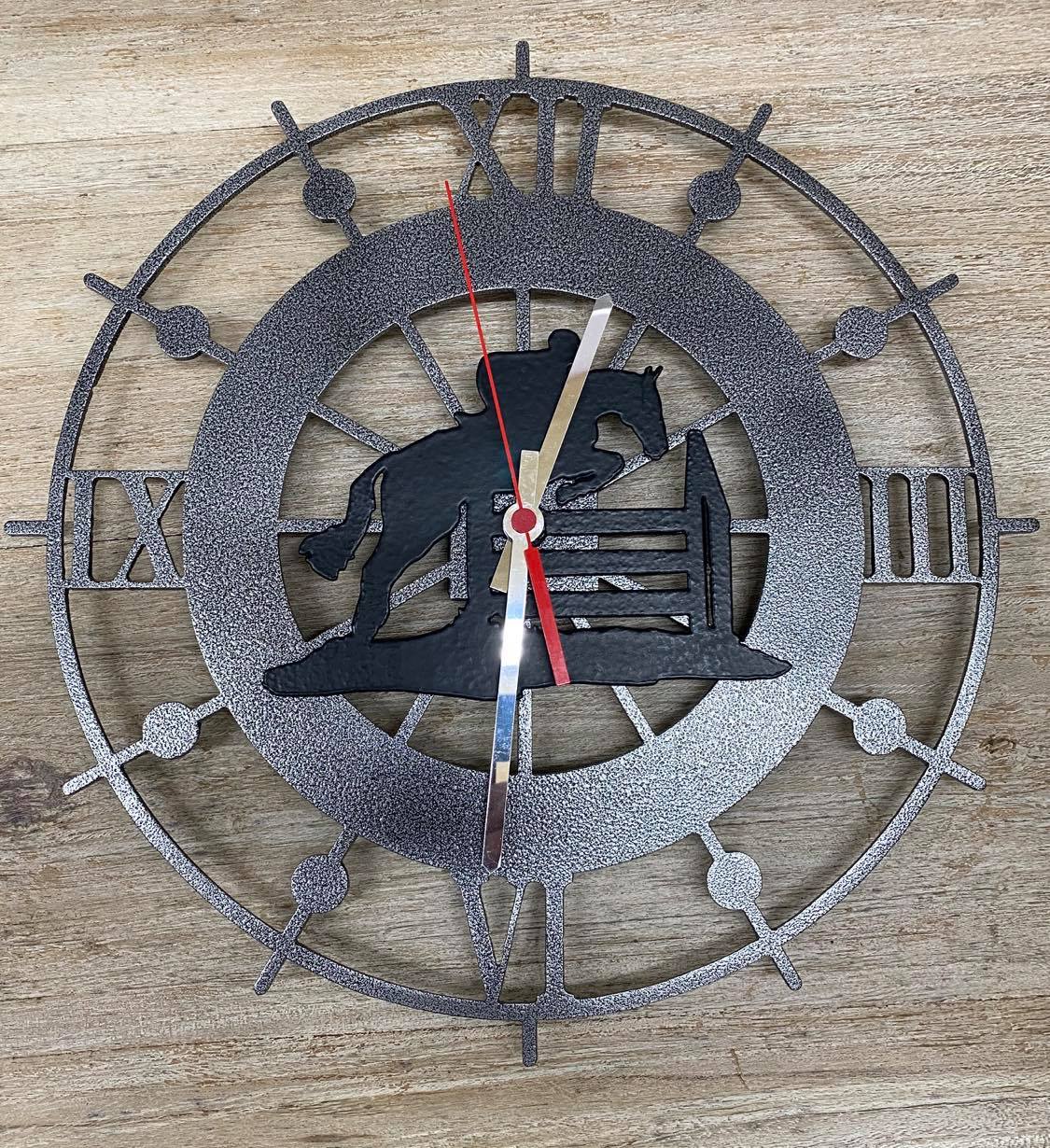 It is 39cm in diameter, is cut from 3mm steel and powder coated in a textured antiqued silver finish. Stainless Steel hands and a red second hand complete the look. It looks beautiful in either a contemporary or a traditional setting.