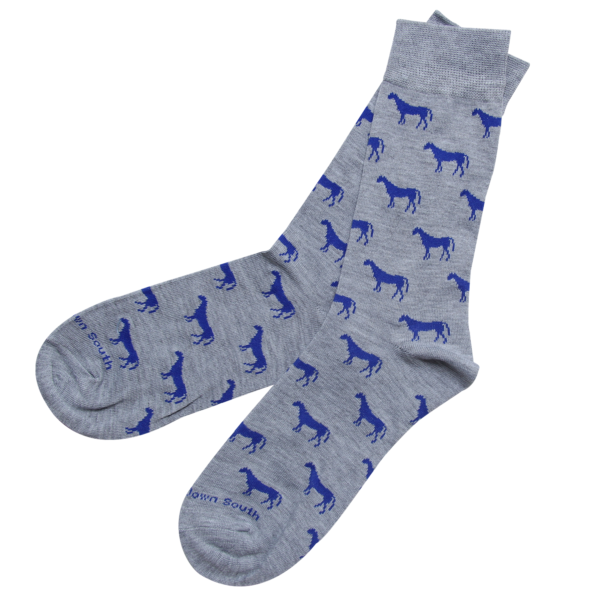 Cosy grey socks featuring a charming blue horse design that captures the spirit of paddock life. Perfect for horse lovers who want to showcase their passion in everyday style. These comfortable socks bring a touch of equestrian charm to your wardrobe, whether you're mucking out or relaxing at home.