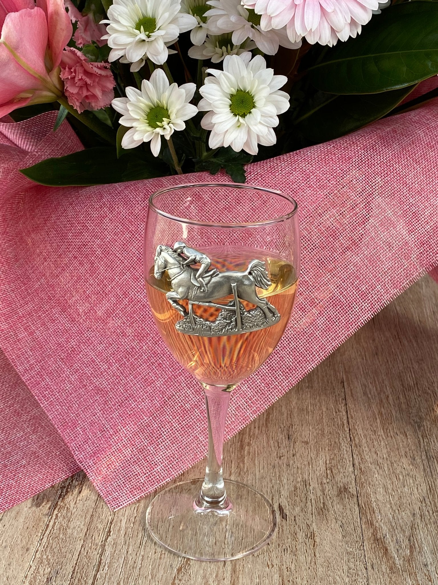 This elegant wine glass features a detailed pewter showjumper motif, perfect for equestrian enthusiasts. Its classic design makes it ideal for enjoying your favorite wine while celebrating your passion for showjumping. Durable and stylish, it’s a great addition to any collection.